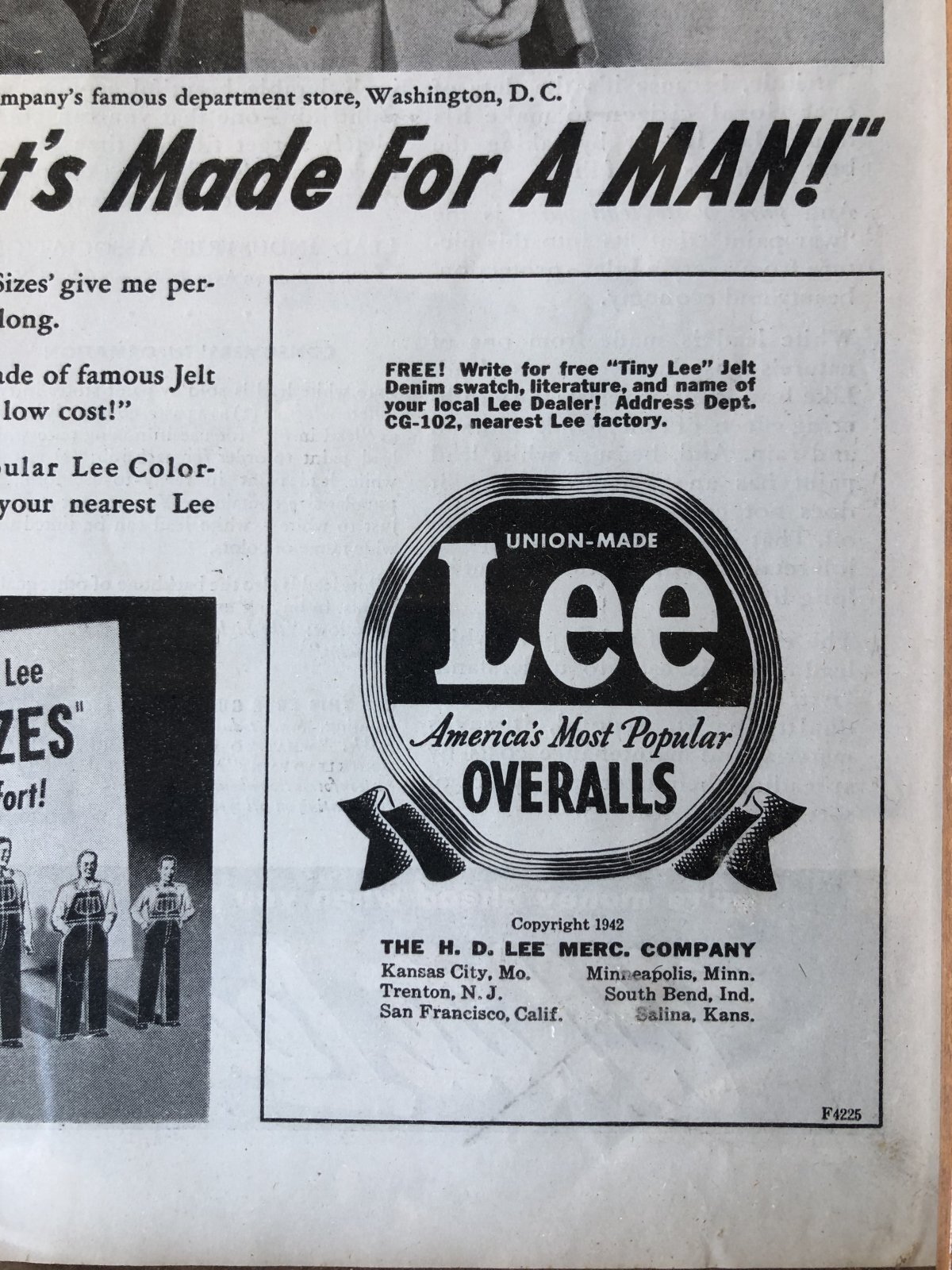 Vintage LEE WORK CLOTHES The H. D. Lee Company Magazine Advertising w/frame (A197)