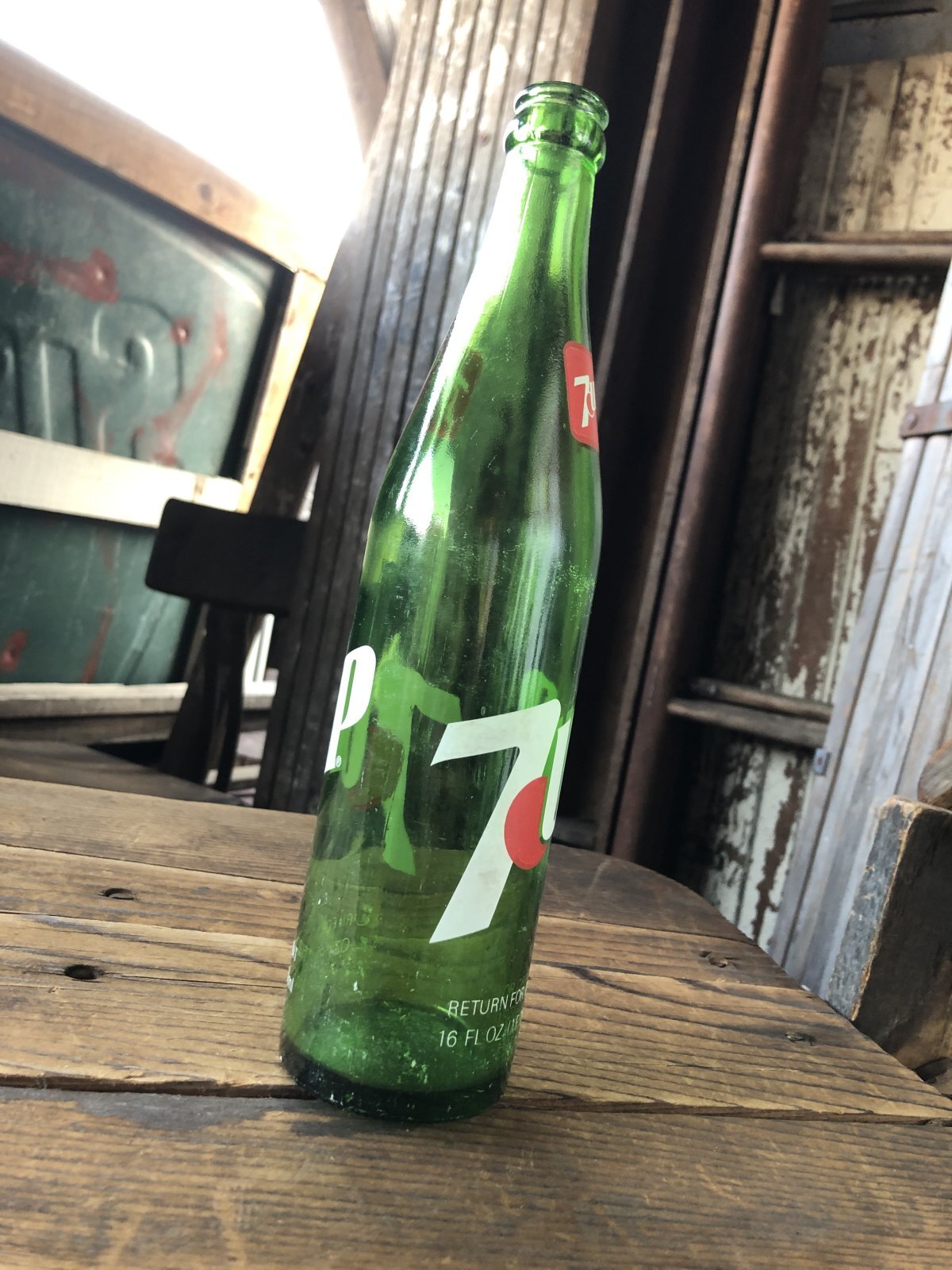 70s Vintage 7UP Soda Green Glass Bottle 16FL OZ (A231)